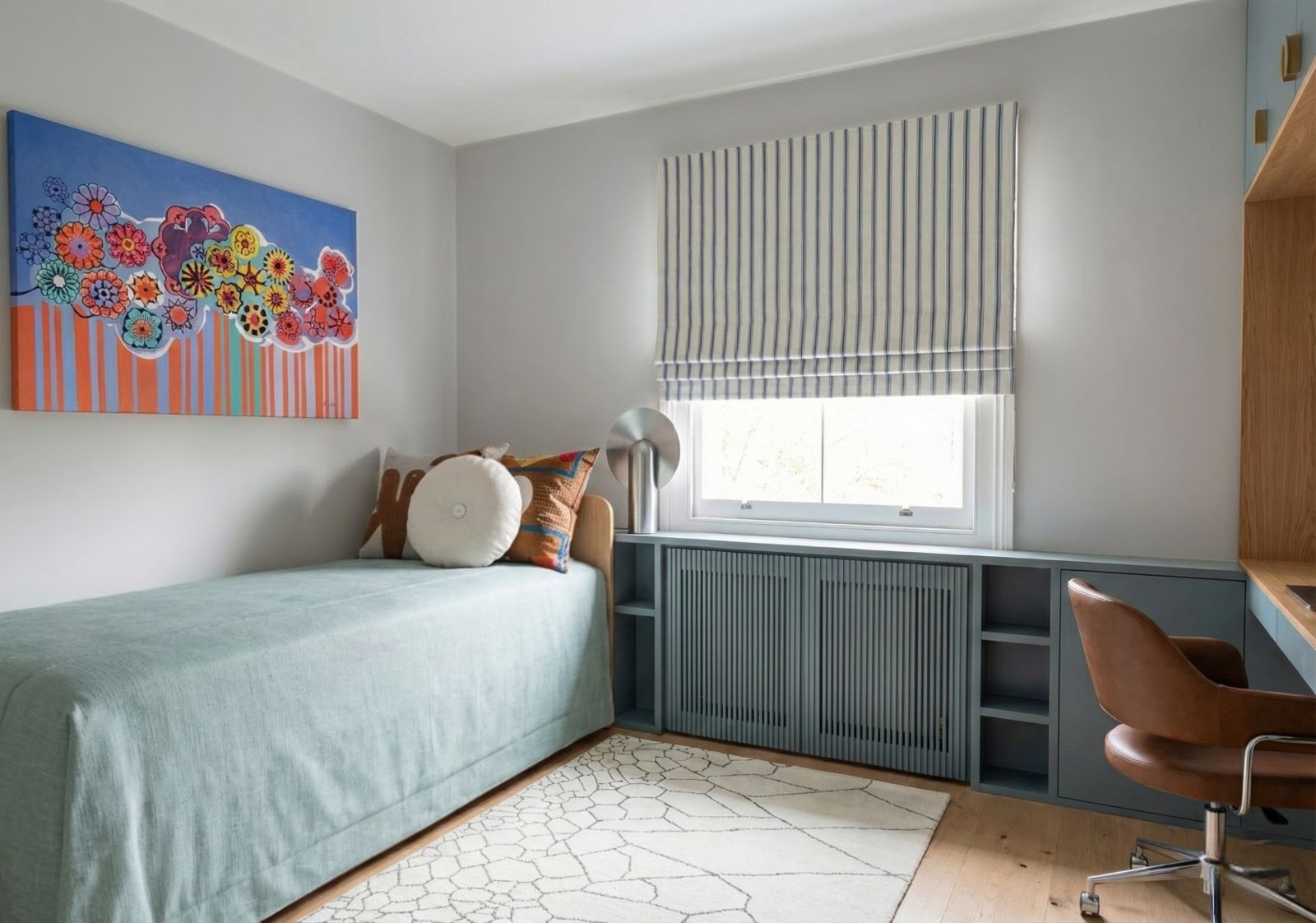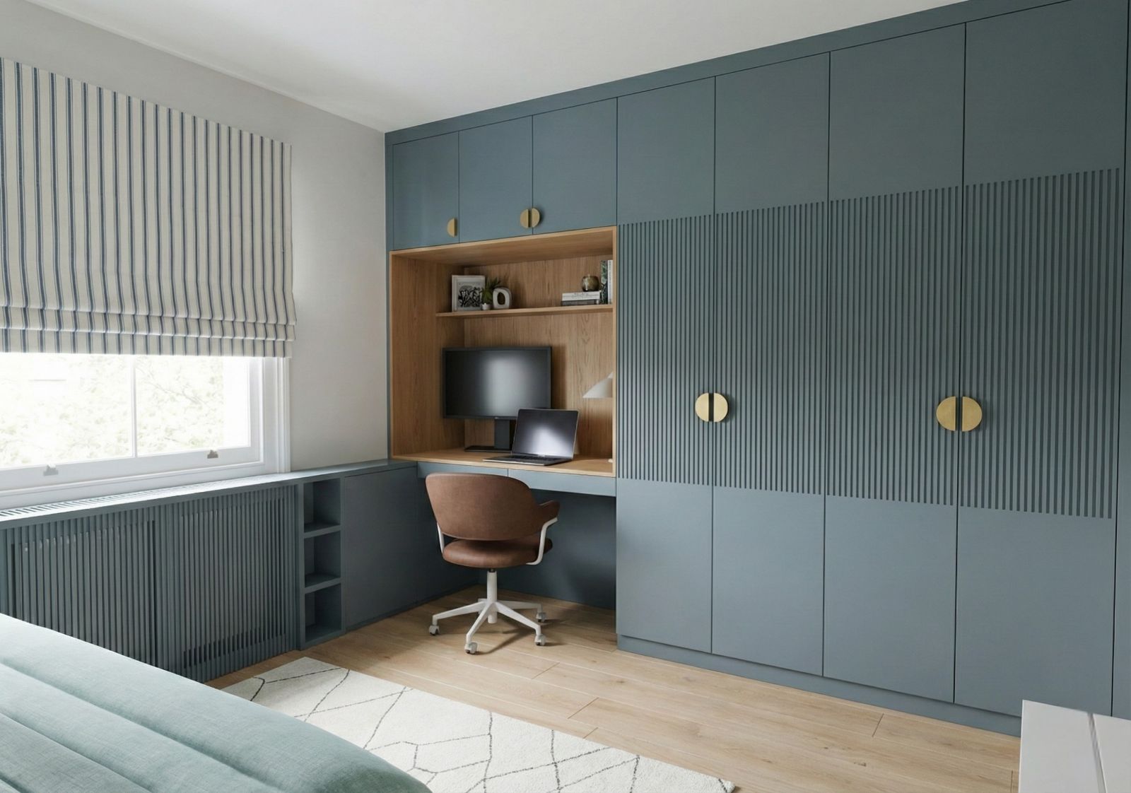 This was a puzzle of millimetres. We had to design joinery that worked around the equipment, rather than letting the equipment dominate the room. We started by positioning the desk to benefit from natural light (without glare) and tucked the Peloton near a discreet power source, leaving the centre of the room open for yoga mats. In the guest room, we designed a shallow run of storage under the window that doubles as a radiator cover and a headboard, solving three problems with one piece of furniture. In a room with this much tech, cables are the enemy. We designed secret access panels within the ribbed walnut desk to hide the inevitable wire mess, keeping the mid-century look clean and uncluttered.