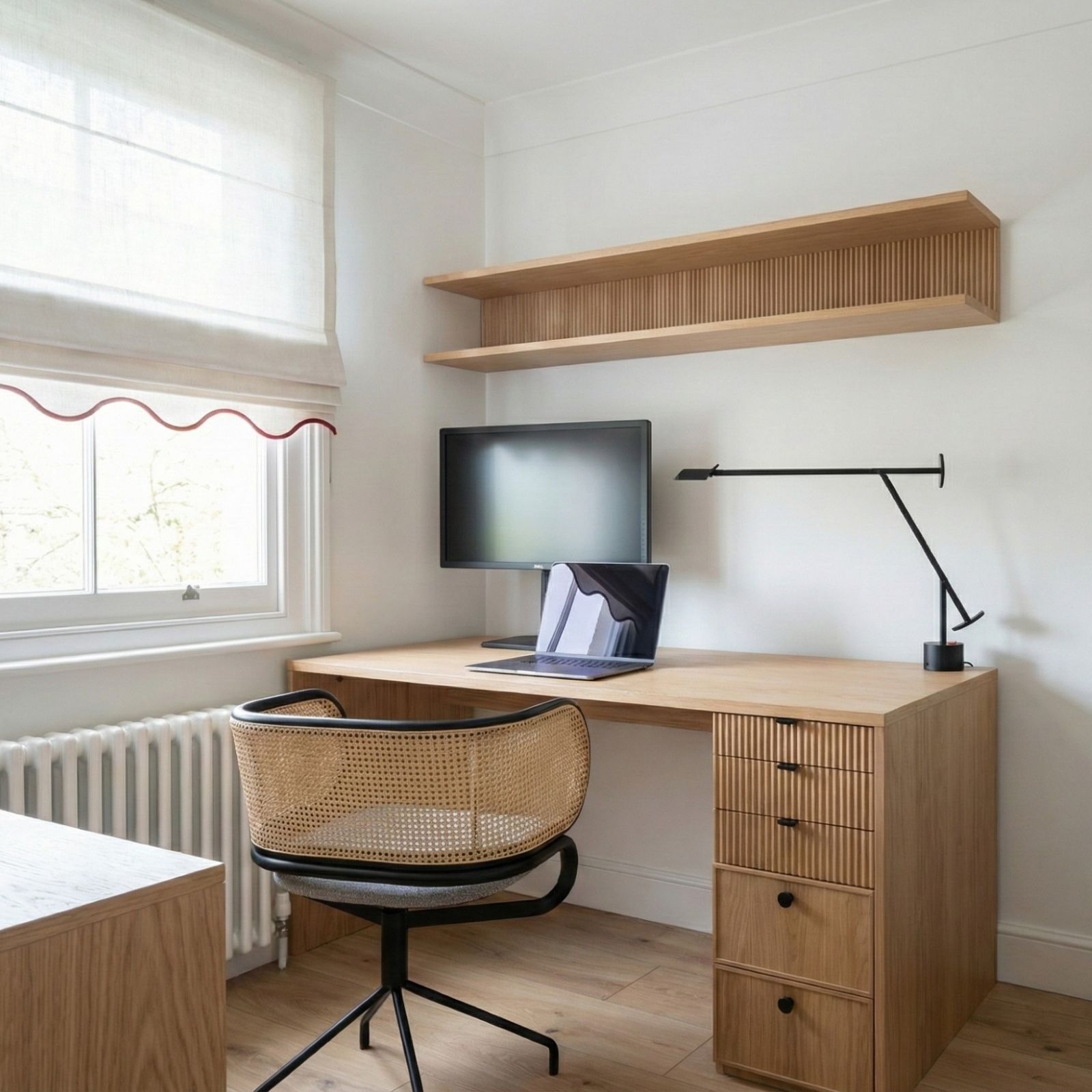 For this busy family of four in Southwest London, space was at a premium. They needed two dedicated home offices that didn’t feel like cubicles. The challenge was particularly tough in the main study: the room needed to comfortably house a full-time workstation, a Peloton bike, a yoga zone, and a sleeping spot for the family dog — all while channeling a stylish mid-century aesthetic.