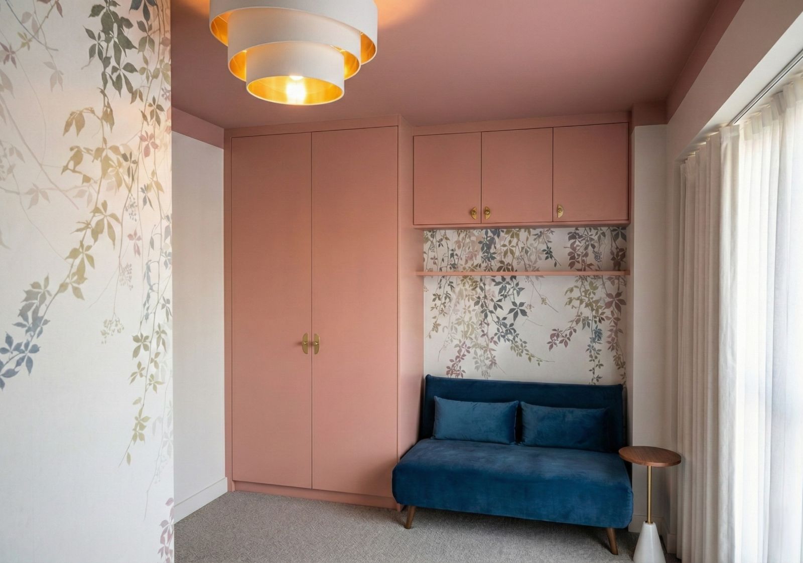 Small spaces require millimetre-perfect planning. We started by presenting three distinct layout options, testing different ways to position the furniture against the large floor-to-ceiling window. They chose a configuration that positioned the desk to face the view (great for mental health) while creating a dedicated “nook” for the sofa bed. Crucially, we designed the layout so the desk and bed are interchangeable, giving the couple future flexibility. To keep the “office” clutter hidden when guests arrive, we designed a custom wardrobe. It works hard: holding paperwork, clothes and even a folding ironing board, all behind clean, minimal doors. Since this room is mostly used by the wife for work, we leaned into a personal palette. We colour-drenched the ceiling in a warm terracotta pink to create a cosy feel, pairing it with a delicate floral wallpaper that acts as a perfect video-call backdrop.