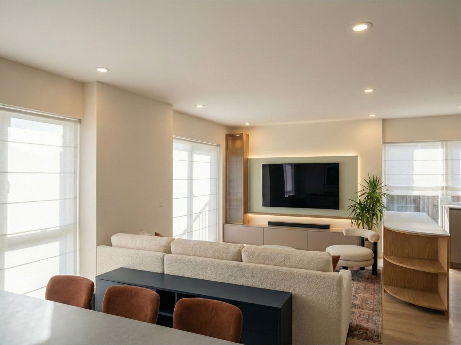 Our clients, a young professional couple in North London, wanted an open-plan living area that worked for two things: relaxing after work and hosting lively dinner parties. The challenge? It was a new-build flat, meaning we had to create a high-end, bespoke feel without moving any existing electrical points or lighting — a strict “no dust” constraint.